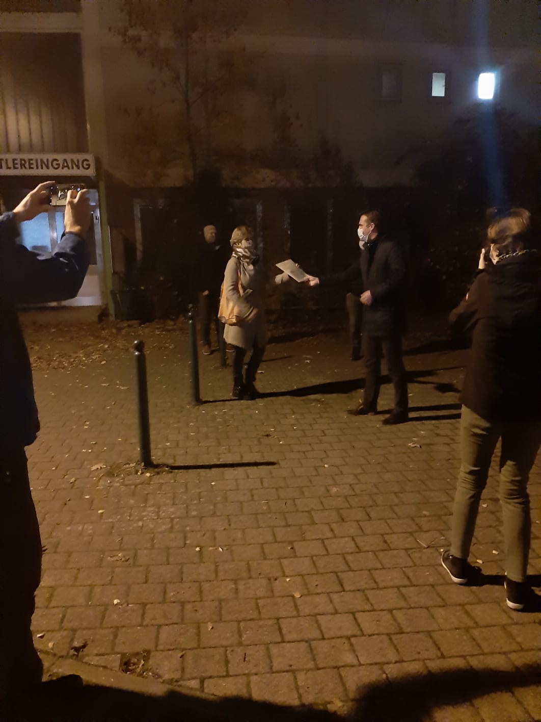 Aus Infektionsschutzgründen traf man sich gestern im Freien mit Abstand und mit Mund-Nasen-Schutz. Der Grund für die nächtliche Begegnung: Vor Beginn der Gemeinderatssitzung, die in der Frankenhalle stattfand, überreichten die Initiatoren des Bürgerantrags „Neutralität zur Steigerwaldbahn“ dem Sennfelder Bürgermeister Oliver Schulze den Antrag zusammen mit den Unterschriftenlisten, auf welchen insgesamt 96 Sennfelderinnen und Sennfelder das Anliegen des Bürgerantrags unterstützten.